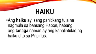 AcoI momonting lomot sa iyoI popolopot Katitibay kang tulos Sakaling datnan ng agos. In modern usage the term tanaga is applied only to poems that fall into the standard 7-5-7-5-7 pattern. I shall cower as the moss To you I shall.