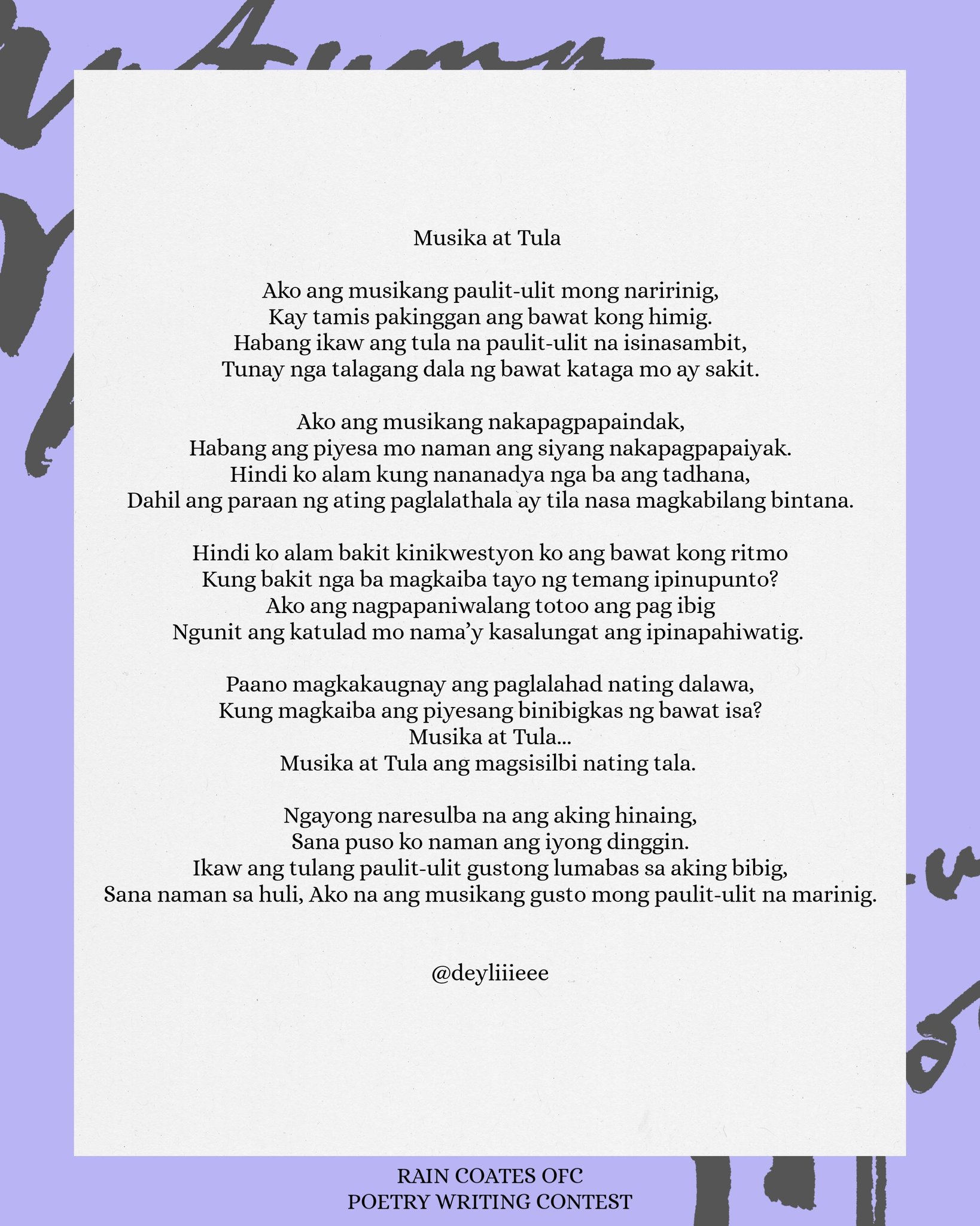 Collection Of Short Poetries Written By. Maaaring tinutukoy ng tula ang kalagayan ng isang tao--sa buhay o sa lipunan. Upang Lipunang Matiwasay ay maganap.